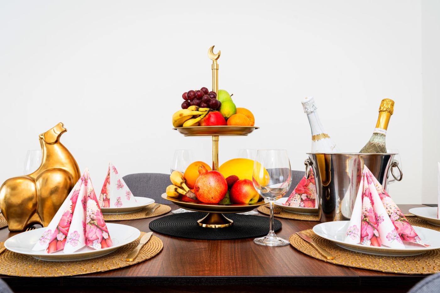 W apartamencie do dyspozycji gości przygotowano kilka sypialni (3), kuchnię ze standardowym wyposażeniem, takim jak lodówka i zmywarka, a także kilka łazienek (2) z prysznicem. Wyposażenie obejmuje także pralkę oraz telewizor z płaskim ekranem z dostępem do kanałów kablowych. W apartamencie zapewniono ręczniki i pościel.