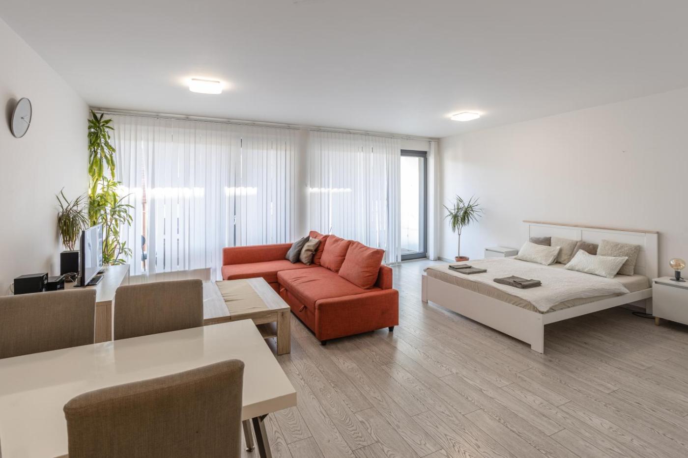 Apartament z 1 sypialnią. This apartment comprises 1 living room, 1 separate bedroom and 1 bathroom with a walk-in shower and free toiletries. Meals can be prepared in the well-fitted kitchen, which comes with a stovetop, a refrigerator, a dishwasher and kitchenware. The air-conditioned apartment provides a flat-screen TV with streaming services, a washing machine, a tea and coffee maker, a seating area as well as garden views. The unit offers 2 beds. Apartament - 4 osobowy. Powierzchnia pokoju ok.: 55 mkw.